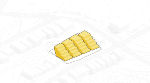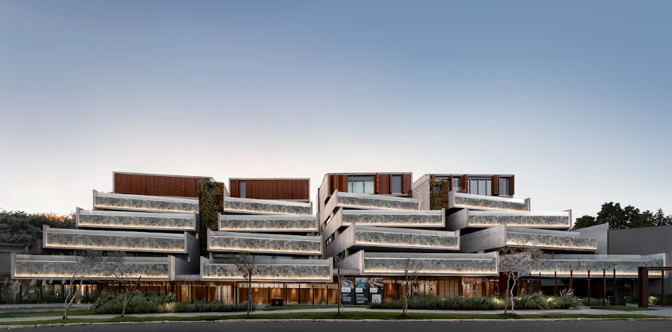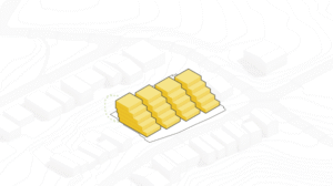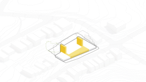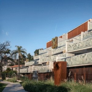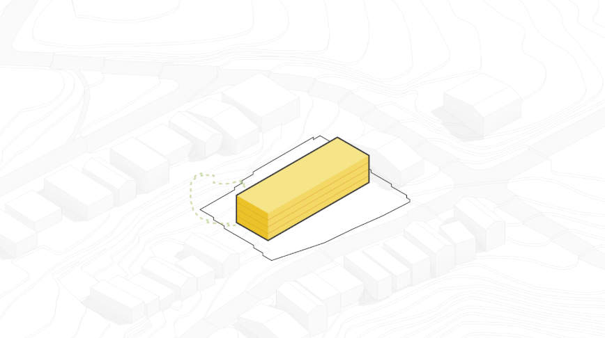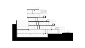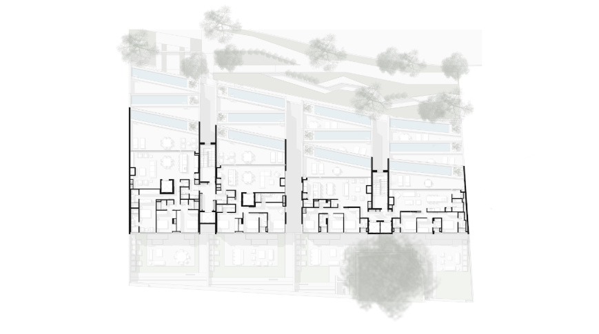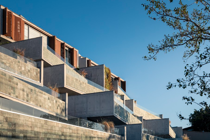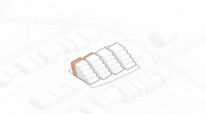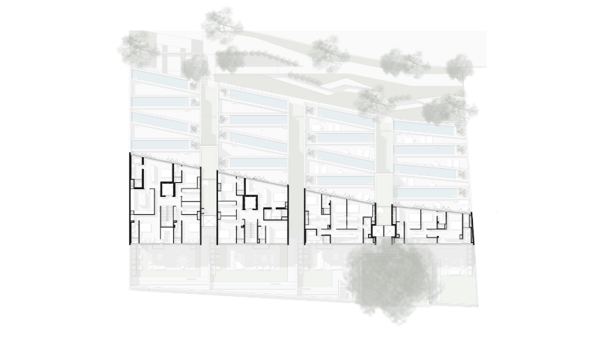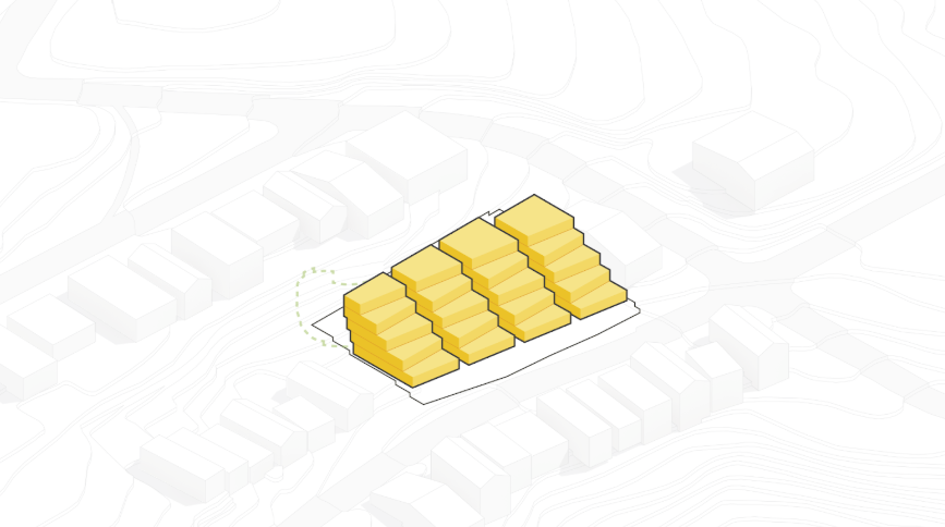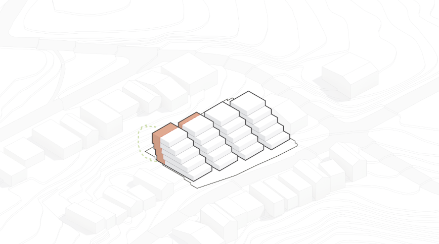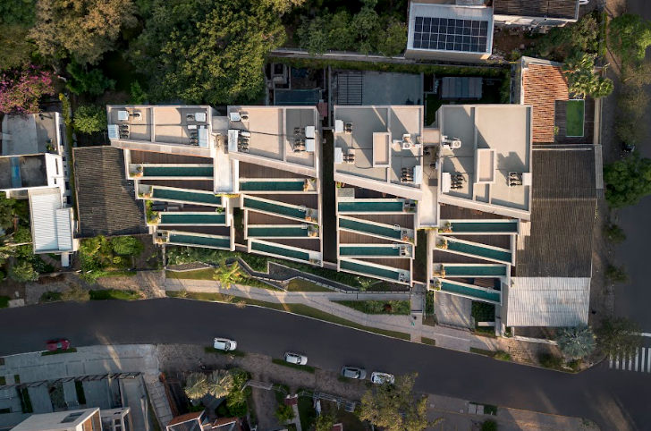 A volumetria do projeto é fruto da ideia de seguir o padrão geométrico do entorno: os quatro lotes existentes são base para quatro blocos, cada qual com quatro apartamentos escalonados. Tal escalonamento não é formalista: a edição do prisma original reduz o impacto da edificação na região, afastando-a da via pública a cada pavimento, além de acompanhar a topografia original do terreno e gerar terraços privativos com piscinas lineares. Entre os pavimentos, ora a frente do apartamento é paralela à via em frente, ora perpendicular à divisa lateral, criando dinamismo para os volumes.