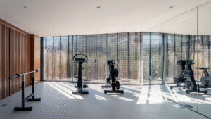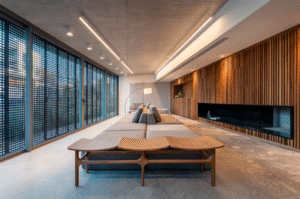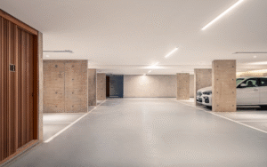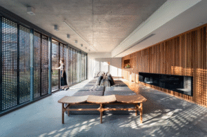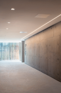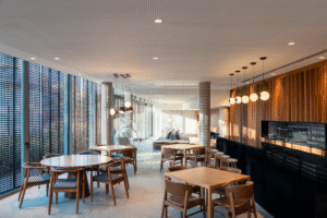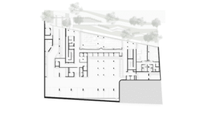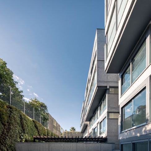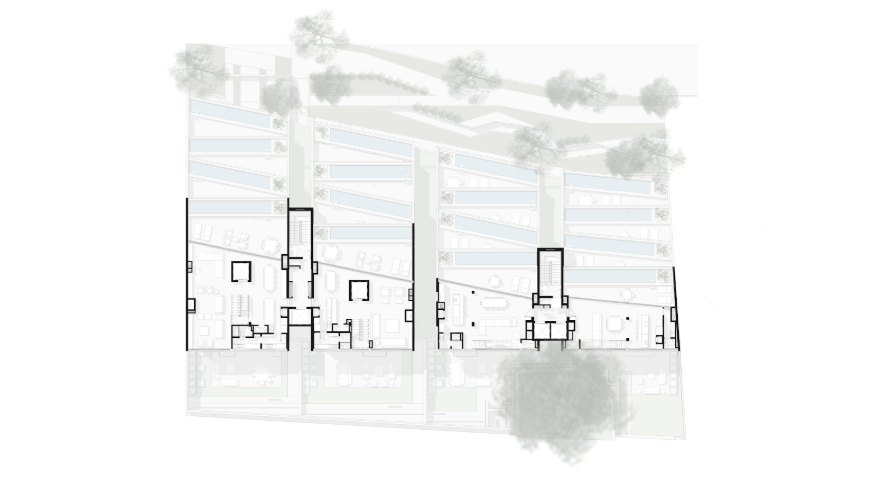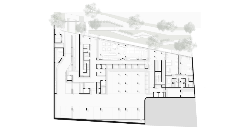 Seguindo a premissa de um urbanismo focado no pedestre e em uma cidade mais permeável visualmente, as áreas condominiais são propostas na fachada do pavimento térreo. Evitando criar um salão de festas convencional, a edificação ganha uma área que, no dia a dia, é entendida como um lounge, uma extensão do hall de acesso. Conforme a necessidade, divisórias retráteis acústicas são fechadas, garantindo o isolamento para o uso privativo. Além do lounge, uma academia, um spa, saunas seca e úmida e uma sala de massagem complementam as amenidades do empreendimento. Atravessando este pavimento, é disposta uma galeria linear com obras de arte de curadoria internacional.