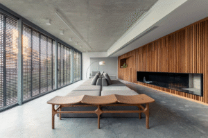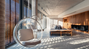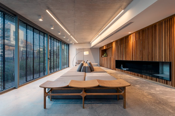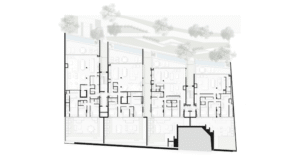 A disposição dos ambientes na planta de cada unidade busca posicionar áreas sociais em frente ao terraço, o que, juntamente com as amplas esquadrias piso-teto, borra as delimitações entre áreas externas e internas, conforme a vontade do morador.