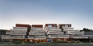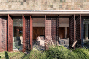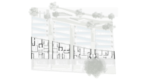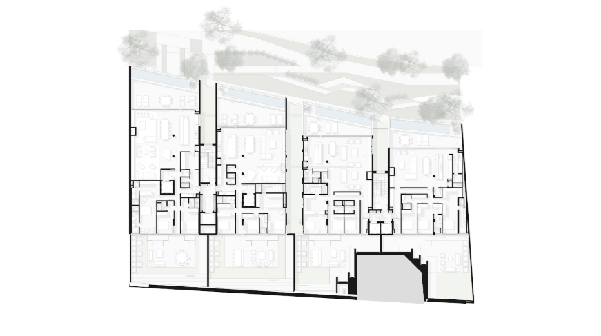 Os terraços são peça importante do projeto. Segundo a legislação local, não são contabilizados como área construída, o que aumenta o potencial de área privativa para venda. Visando gerar maior privacidade entre as unidades e reforçar o conceito de casas suspensas, cada apartamento ganha uma bandeja com seção “U” em concreto aparente, coroada na sua frente pela piscina revestida em pedra Hijau.