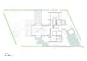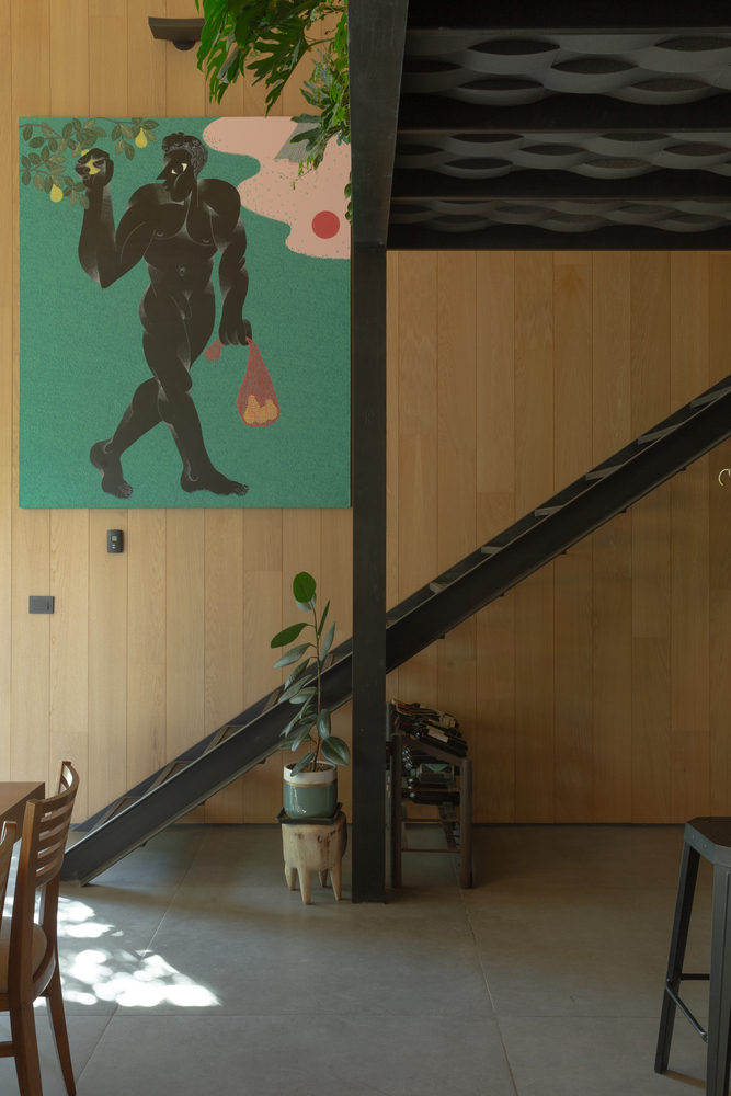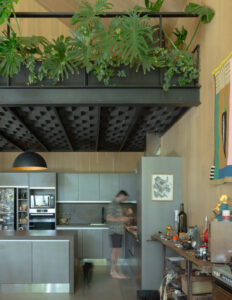 • Mezanino: Um nível superior abriga um espaço de trabalho e relaxamento, enriquecido por vegetação interna que adiciona vida e frescor.