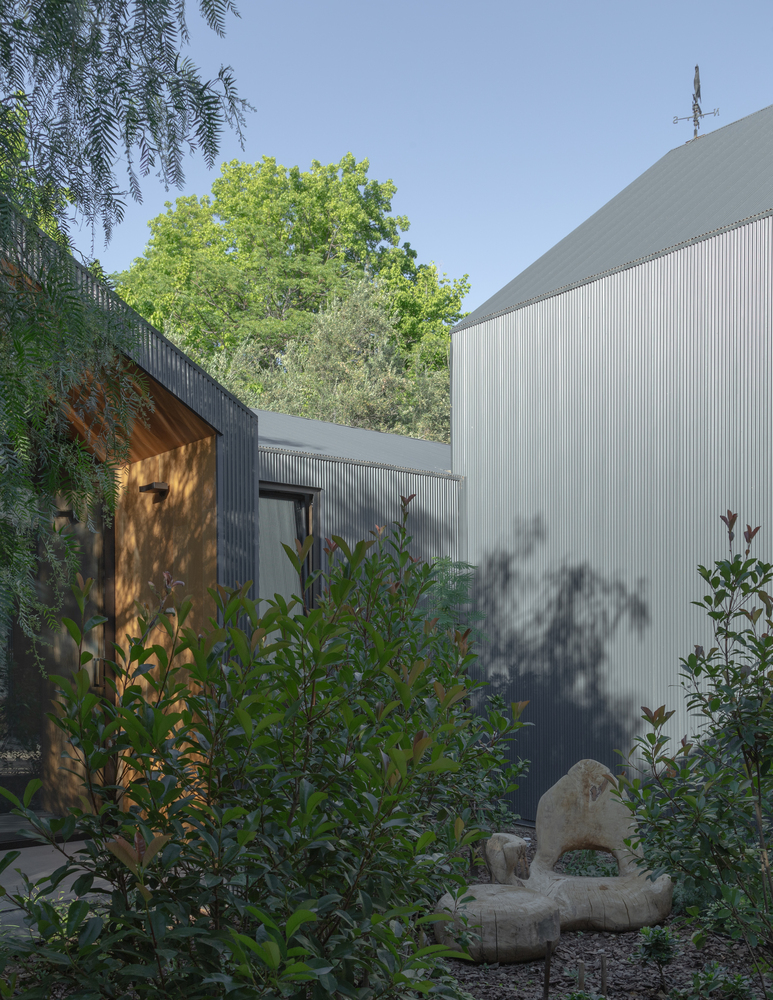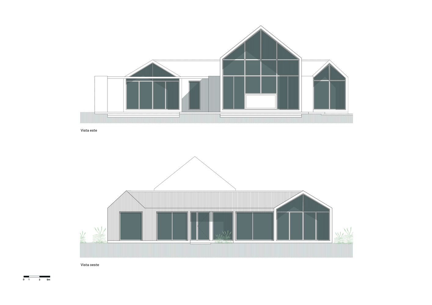 A escolha dos materiais é fundamental para a estética coesa e moderna do projeto. Os volumes externos são uniformemente revestidos com chapa microacanalada, conferindo unidade e um caráter marcante ao conjunto. O uso de vidro e metal preto perfurado nas vedações proporciona leveza e permeabilidade, incentivando a interação com o exterior e a ventilação cruzada.