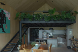 No interior, o contraste é estabelecido com o revestimento total de paredes e tetos em madeira, que introduz uma sensação de calor e aconchego, suavizando a robustez da estrutura metálica. O piso de concreto polido reforça a estética clean e contínua, criando uma atmosfera harmoniosa e sofisticada.
