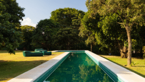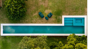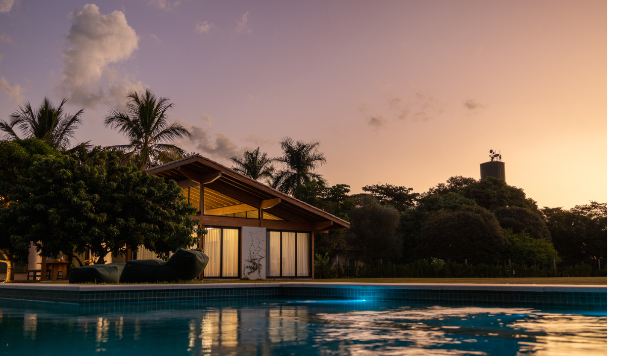 Na piscina, uma raia de 25m sob a copa de uma jaqueira foi projetada para futuramente já se conectar com a expansão da casa principal e desde hoje garante o divertimento da família em dias ensolarados.