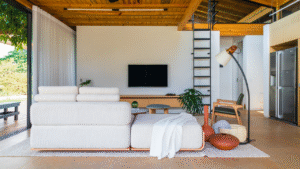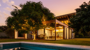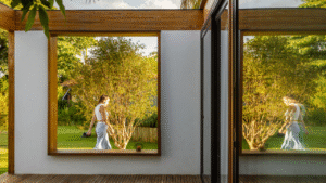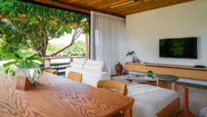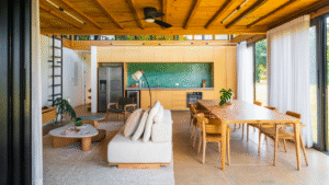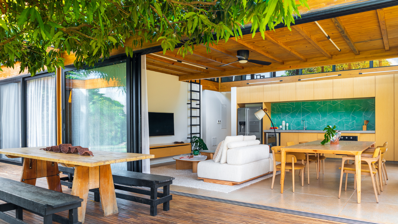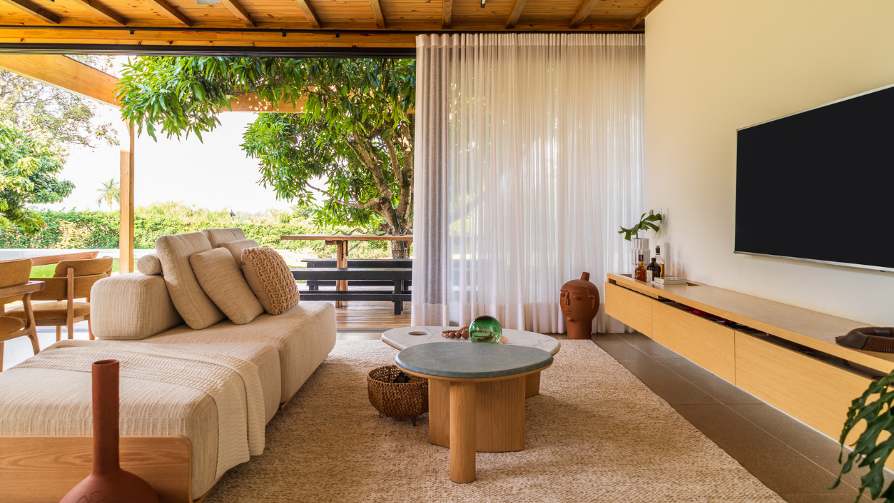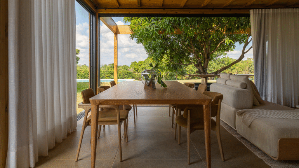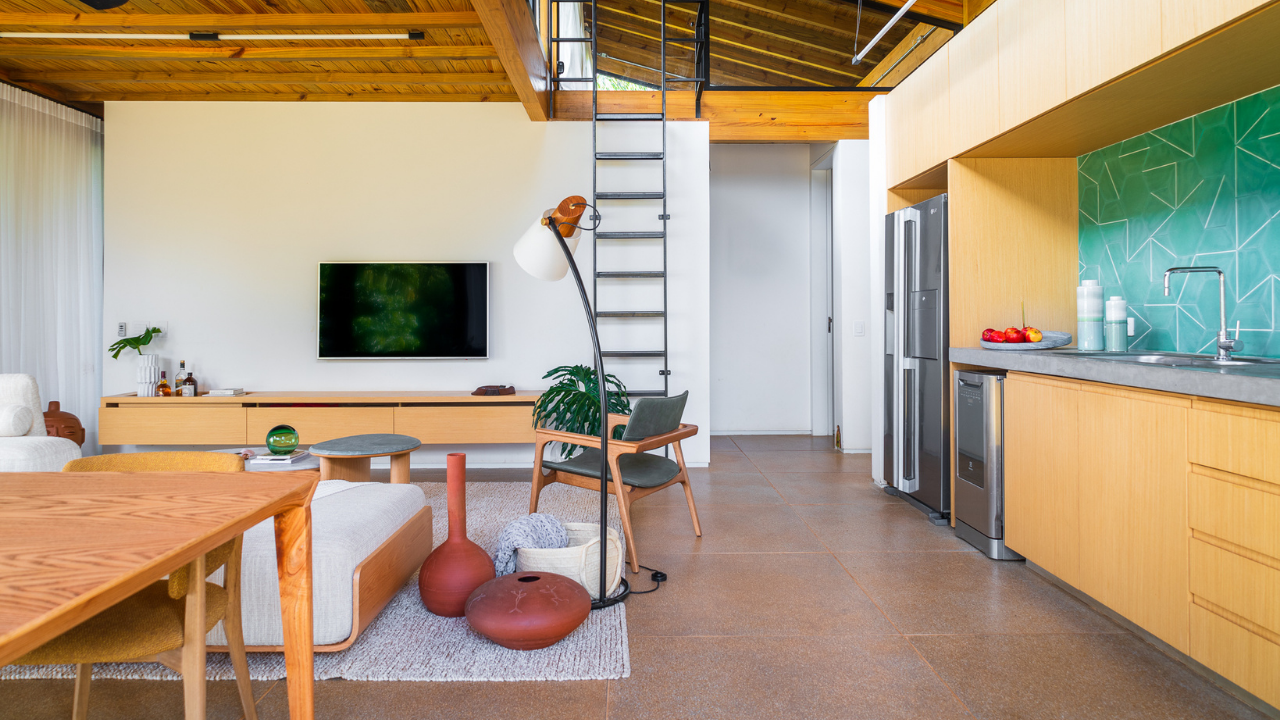 Internamente, mobiliários com design atemporal e autoral criam uma atmosfera de aconchego aos moradores. A paleta de elementos naturais como a madeira da estrutura e do forro, o piso de granilite, a bancada de concreto e ladrilhos na parede da cozinha, reforça o partido de casa de campo inicialmente idealizado como moradia dessa família.