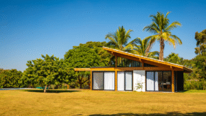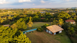 O amplo lote de mais de 5000m² possui topografia plana além de já conter algumas árvores adultas capazes de criar muitas sombras e uma casa na árvore para os filhos que estavam por vir. Vindos da capital paulista, os clientes encontraram neste terreno a sensação de um local de refúgio e proximidade com a natureza que dificilmente outra moradia na cidade onde moravam poderia proporcionar. Cabia ao projeto criar a conexão da arquitetura com a ideia de uma casa menos urbana onde a implantação da casa respeitasse exatamente a locação das árvores já existentes.