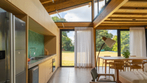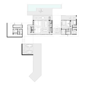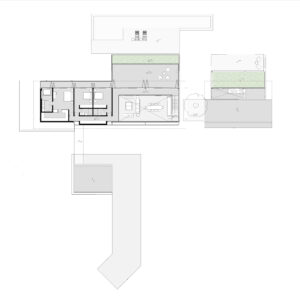 Duas suítes, lavabo, sala de estar, jantar, cozinha, lavanderia e um escritório foram pensados para abrigar novos usos no futuro que pudessem complementar o programa da casa principal.
