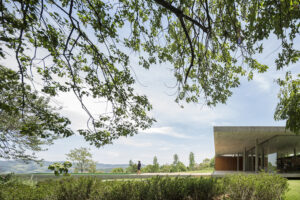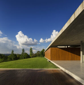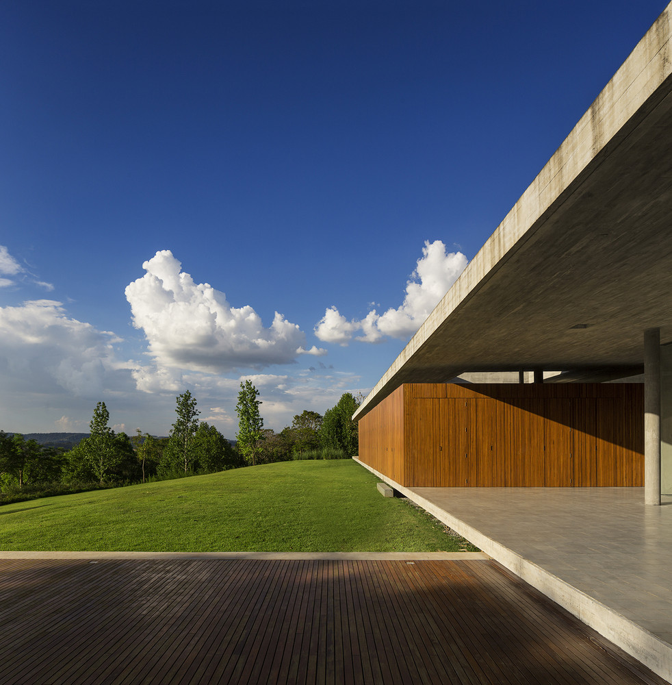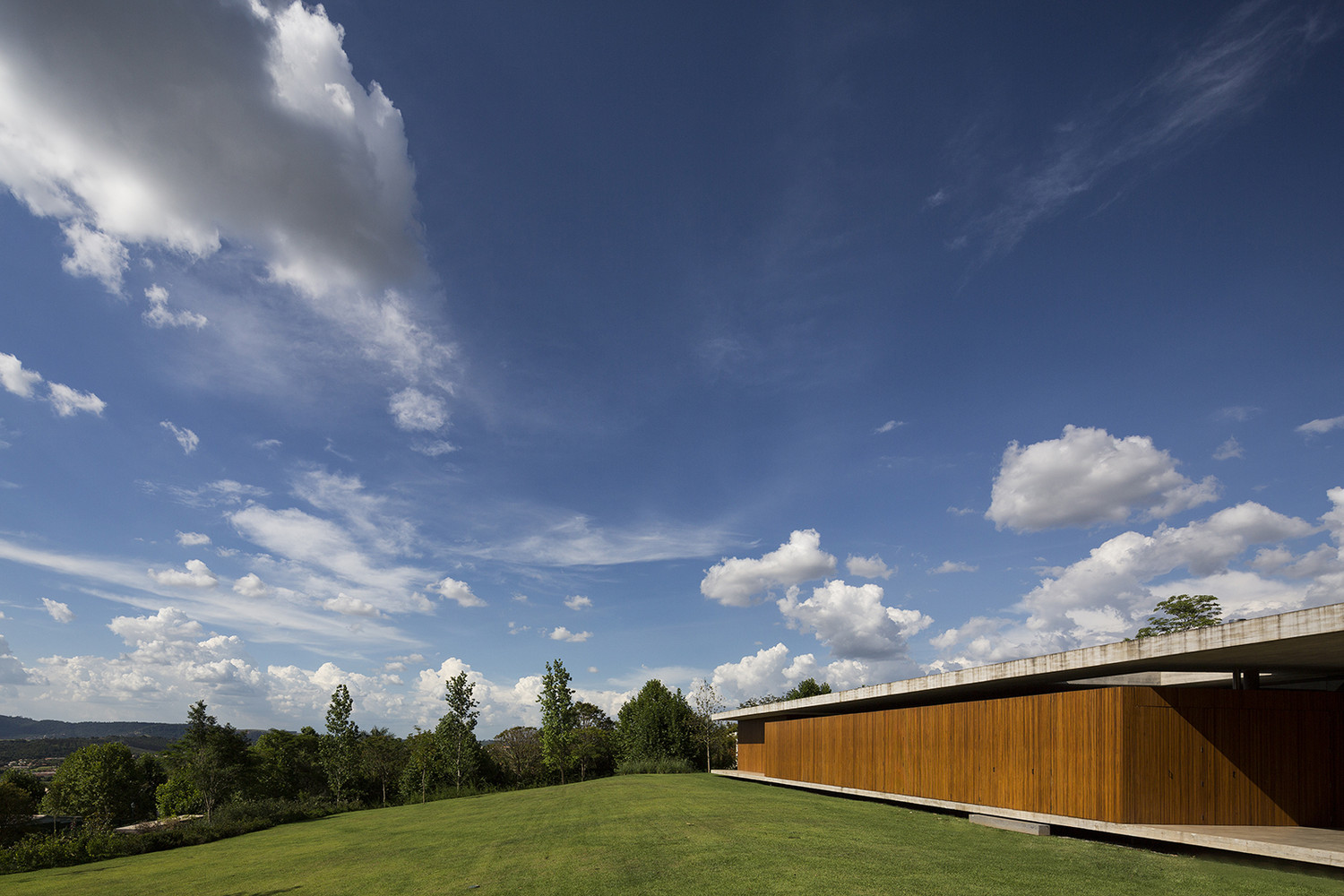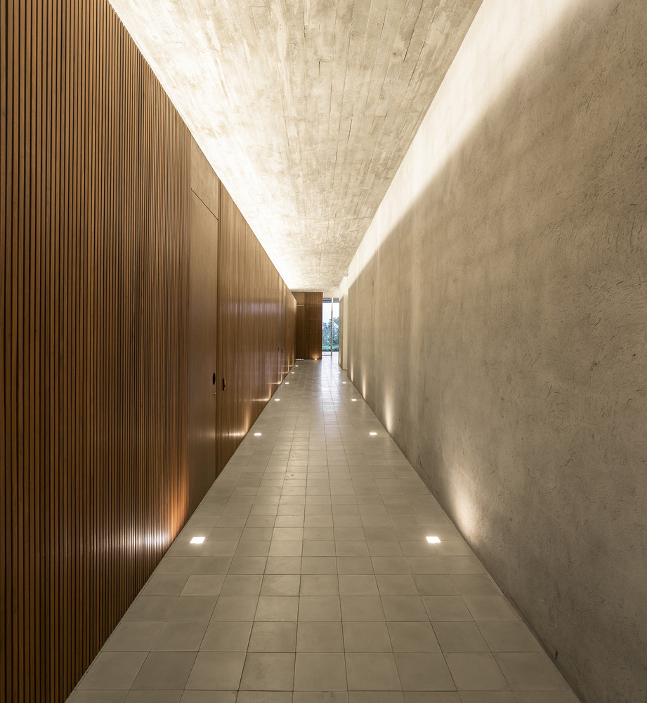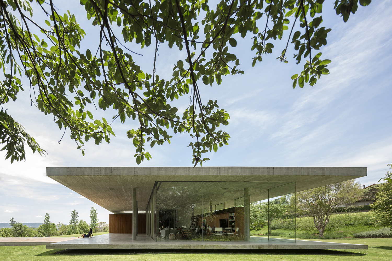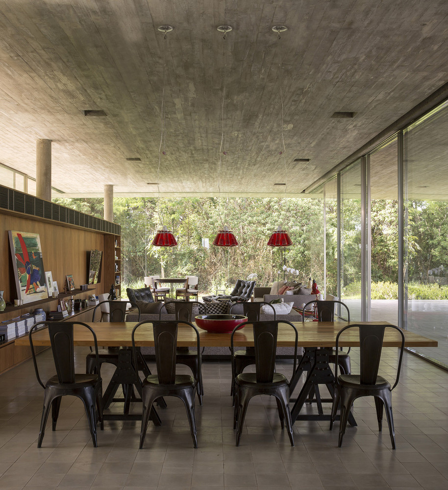 - A laje de cobertura, com 37 cm de espessura, estende-se para além dos limites da construção, proporcionando generosas áreas de sombra e proteção solar. Com o mesmo tamanho da laje de piso, ela unifica visualmente o conjunto [1, 2].
