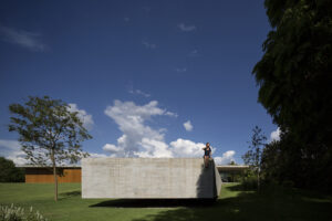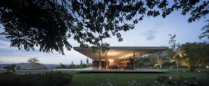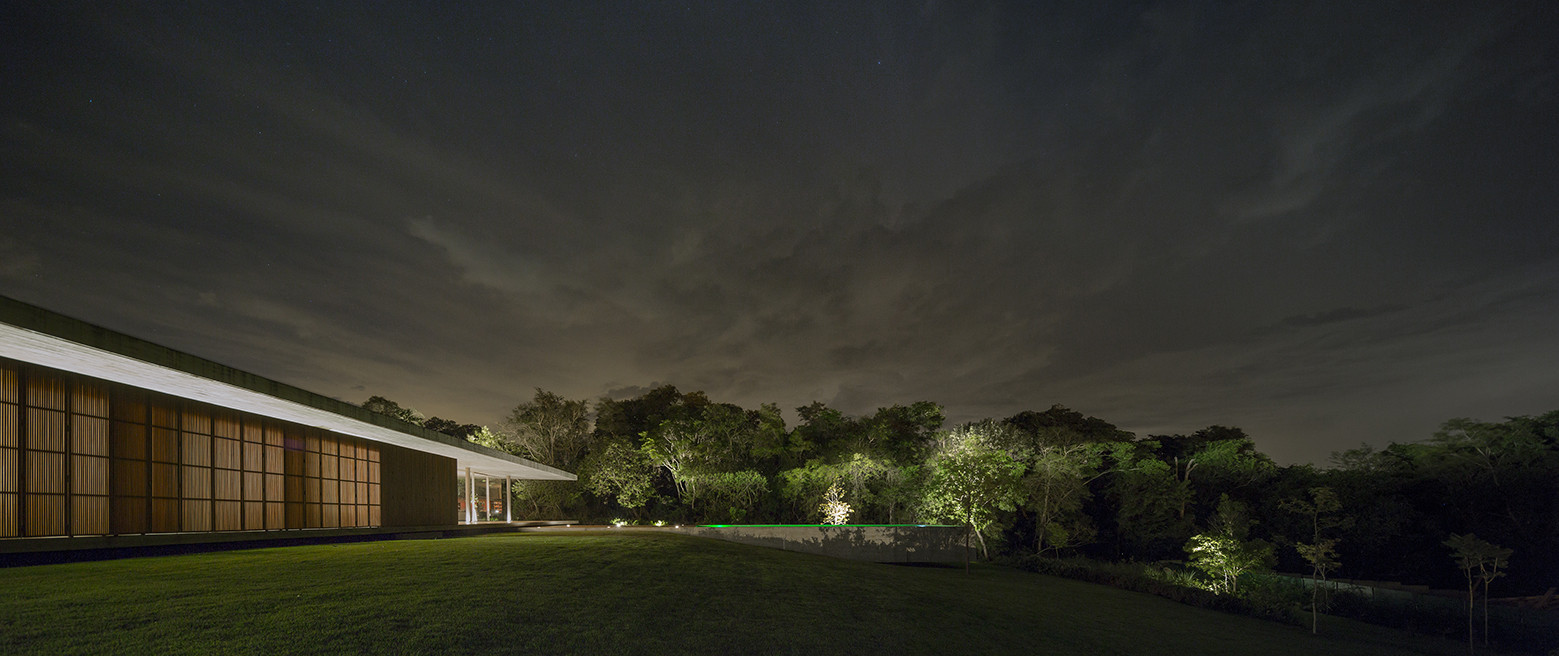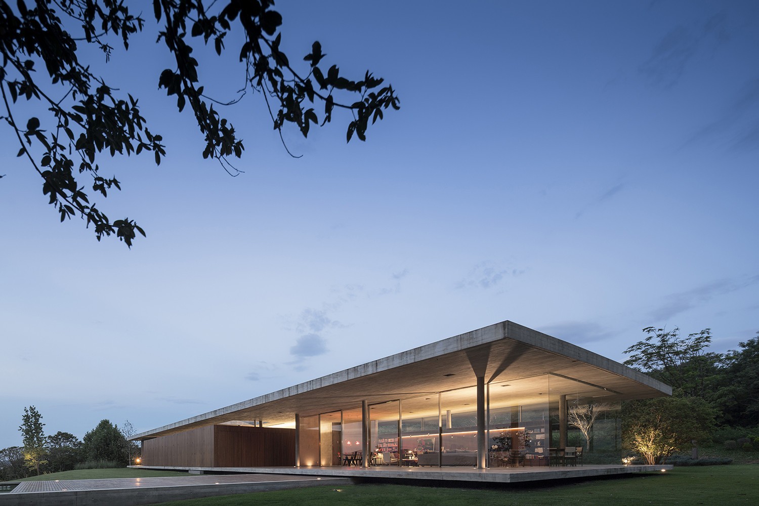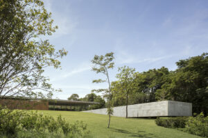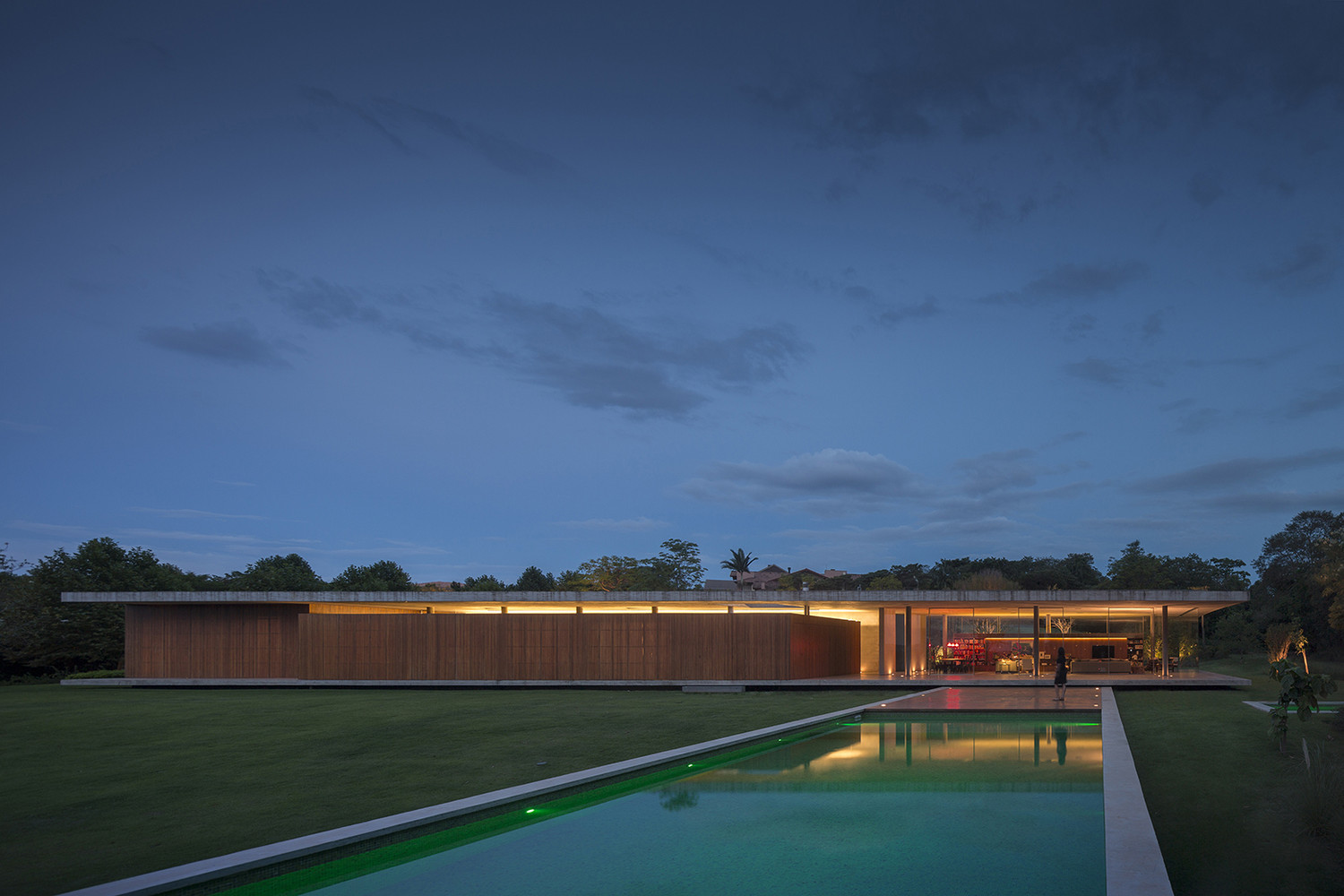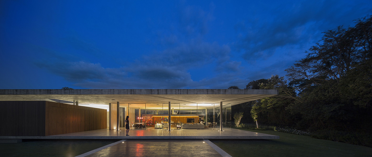 A ideia da casa-pavilhão, como a Farnsworth House de Mies Van der Rohe, evoca habitações térreas que parecem flutuar sobre o terreno, emolduradas por elementos arquitetônicos singulares e cercadas por jardins. O Studio MK27 abraça essa premissa na Casa Redux, utilizando lajes planas e uma composição formal de cheios e vazios para criar uma estrutura que dialoga intensamente com seu entorno natural [1].