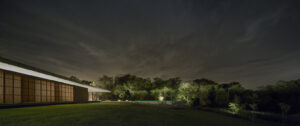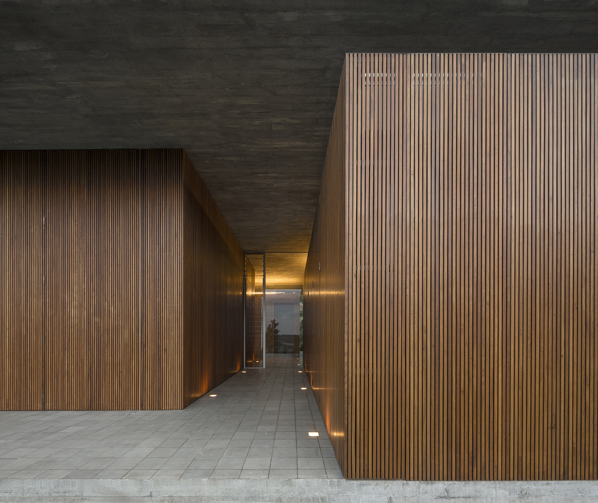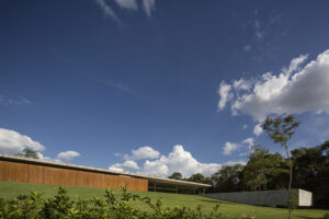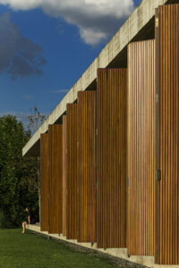 A madeira, por sua vez, introduz calor e textura. Os volumes dos dormitórios são revestidos por painéis ripados verticais de madeira que podem ser abertos quase que totalmente. Durante o dia, esses painéis atuam como brises, filtrando a luz solar e criando um jogo de luz e sombra no interior. À noite, quando iluminados de dentro, transformam as caixas em grandes lanternas, adicionando um elemento lúdico e dinâmico à fachada [2].