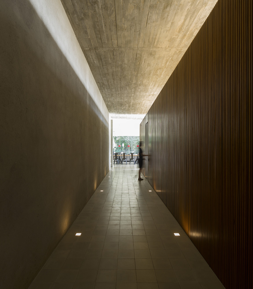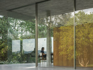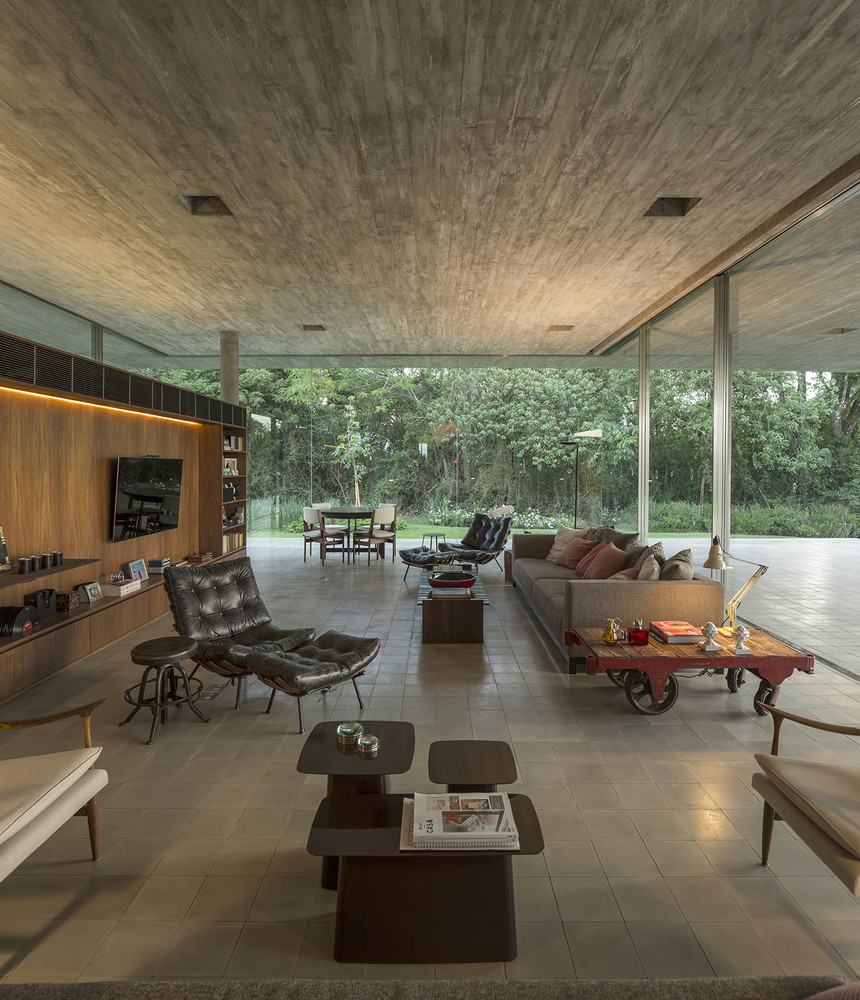 A distribuição desses blocos na laje de piso gera espaços intersticiais que se transformam em áreas de circulação, varandas e da sala de estar. Este último, envolvido por uma pele de vidro com folhas de correr, estabelece um diálogo contínuo e fluido entre o interior e o exterior, permitindo que a paisagem se torne parte integrante do ambiente construído [2].