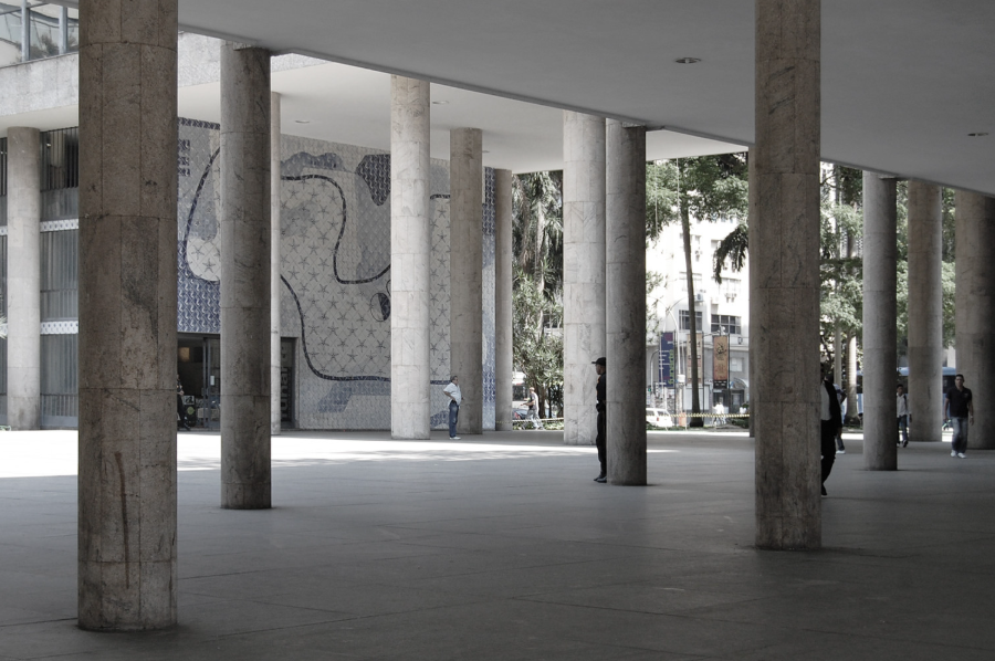 A estrutura é composta por pilares de concreto armado, liberando o térreo para uso público e criando uma sensação de leveza e transparência. O volume principal elevado contrasta com o pavimento térreo ajardinado, onde obras de arte e paisagismo se integram à experiência arquitetônica.